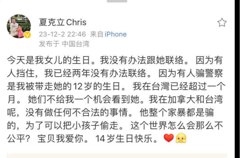 12月2日,夏克立在社交平台发文为女儿夏天庆生,并称已经有两年没有办法联络到女儿,因为有人挡住,“她们不给我一个机会看到她”“我没有做任何不合法的事情,她整个家暴都是骗的,为了可以把小孩子偷走。”