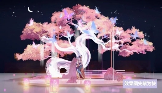 命格桃花树灯组以蝶舞之姿象征着春日将至与新一年的美好愿景,整体呈现出繁盛吉祥的造型,传达出生生不息的生活观。