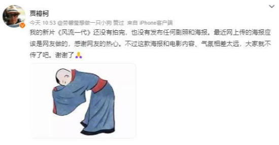 原标题:贾樟柯回应网传《风流一代》海报 透露新片未拍完