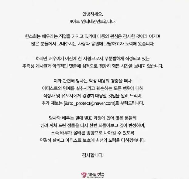 3月18日,韩素希经纪公司表明将起诉损害艺人名誉的行为,对造谣和传谣的人采取法律措施。此前,有媒体报道称柳俊烈和韩素希正在热恋中。
