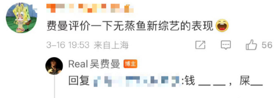 16日,有网友给费曼留言让他评价一下老爸吴镇宇在新综艺《无限超越班》的表现。随后费曼在评论区用填字游戏的方式回复该网友,称:“钱______,屎______”。