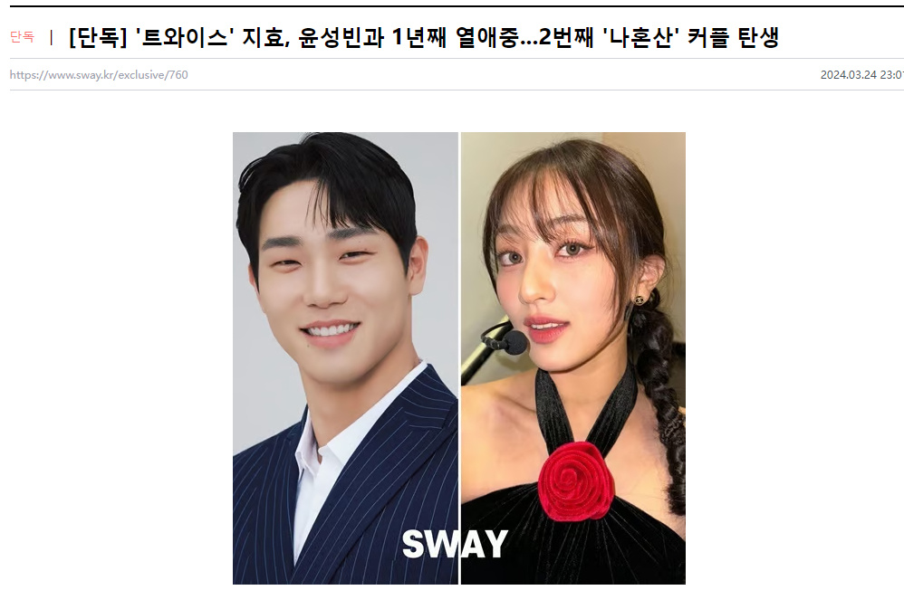 3月24日晚间,据韩媒报道称,TWICE队长朴志效被曝与前钢架雪车运动员尹成彬通过熟人的介绍相识,自然而然地发展成为恋人,并已交往了一年。与此同时,两人也成为节目《我独自生活中》的第二对情侣。