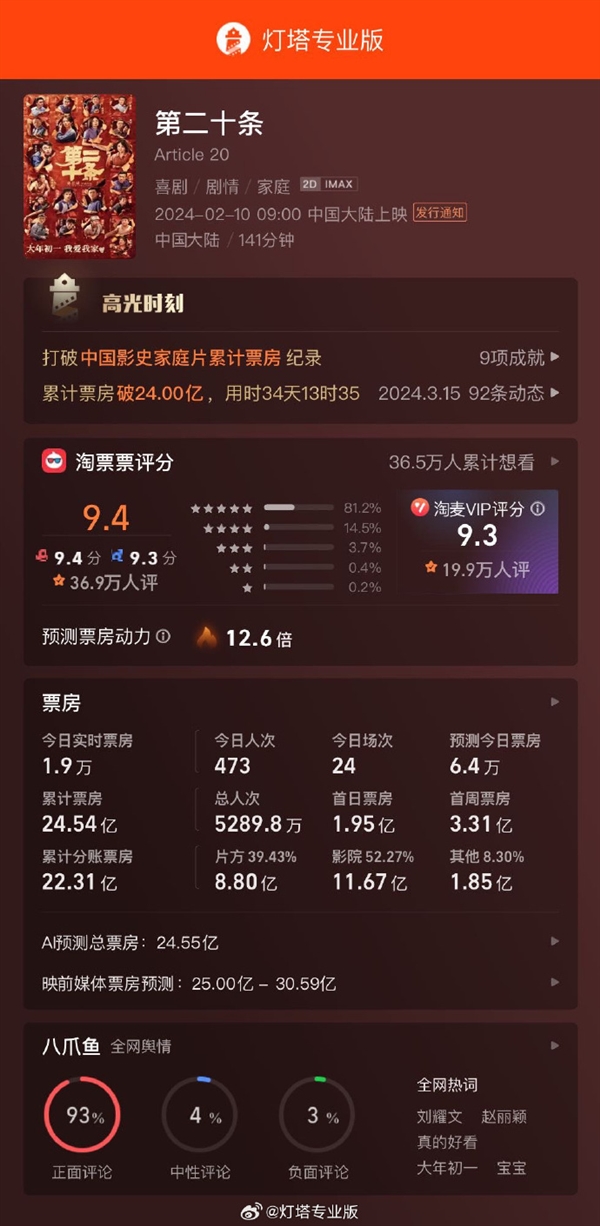 据灯塔专业版,影片《第二十条》今日结束最后一天公映,最终票房24.54亿,位列当前中国影史票房榜第28位!