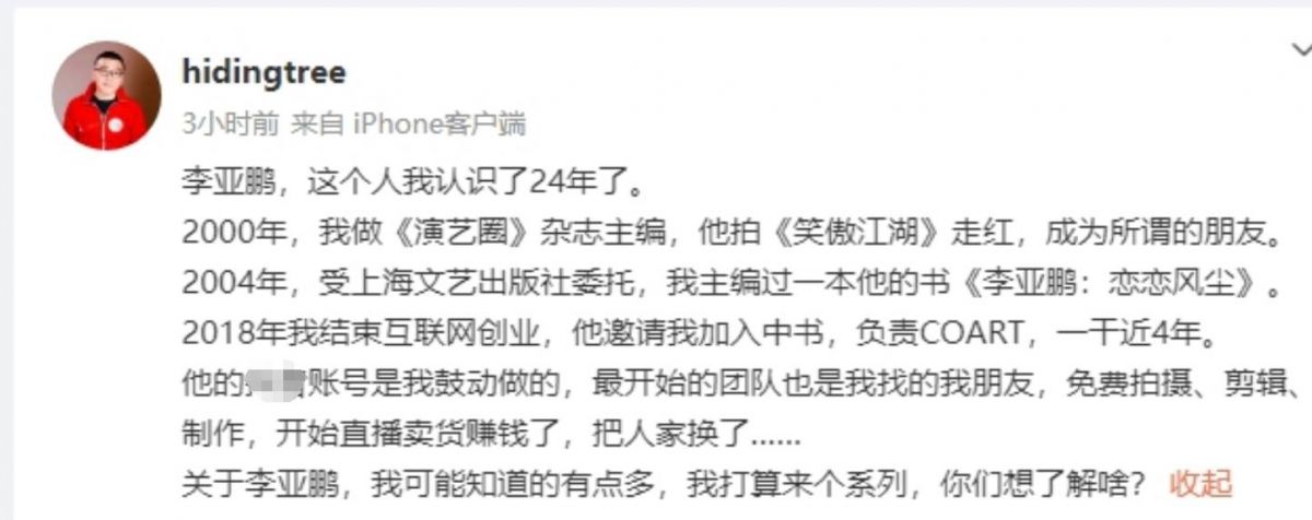 据悉,该网友自称认识李亚鹏超过了20年,其平台账号的团队搭建,也是由自己找朋友建立,相当于免费帮李亚鹏拍摄制作。